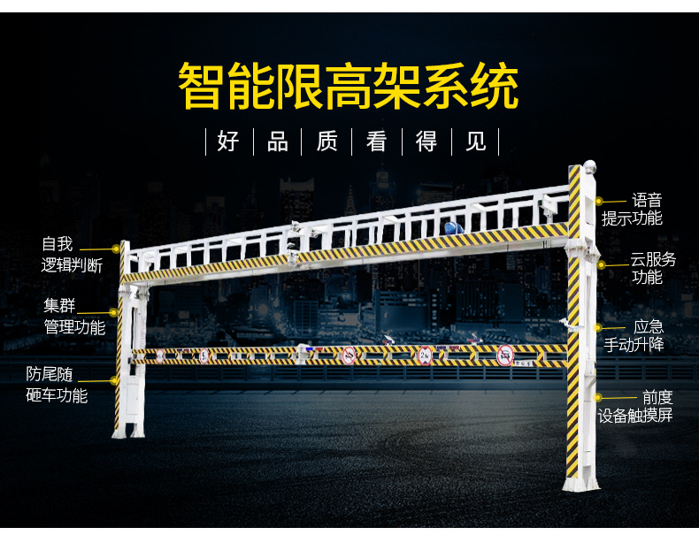 • 自我邏輯判斷:當車輛緩行沒有按規定時間通過,限高架自動 識別不再下降, 車輛通行完畢后可自動回位到設定高度 ;